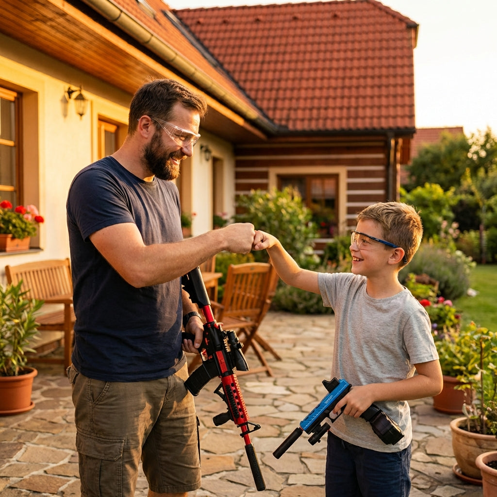 Zásah je cítit, ale díky nižšímu výkonu nezraní a nezanechá modřiny. S ochrannými brýlemi v balení je to bezpečná zábava, která vás sblíží více než společné sledování televize.